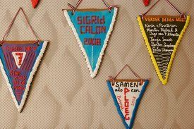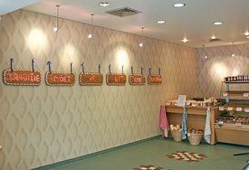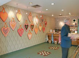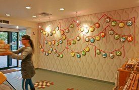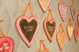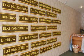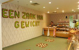 Gedurende 7 weken veranderde ik elke week de achterwand van de bakkerij met oude Ploeg-Poster-teksten gemaakt van koekdeeg en icing.